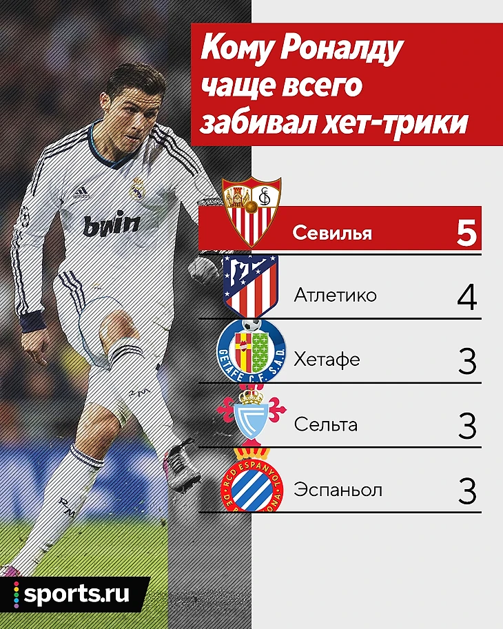 Кто чаще всего страдал от трешек Криштиану? Все жертвы – из Ла Лиги.