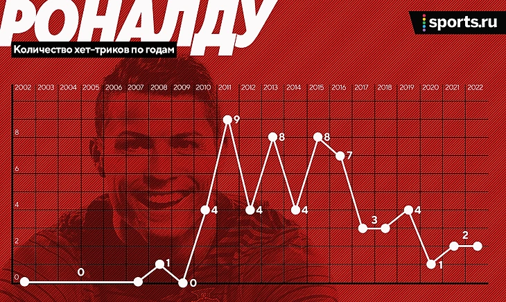 Для наглядности – раскладка по годам: с 2010-го по 2016-й португалец делал минимум 4 хет-трика за сезон.