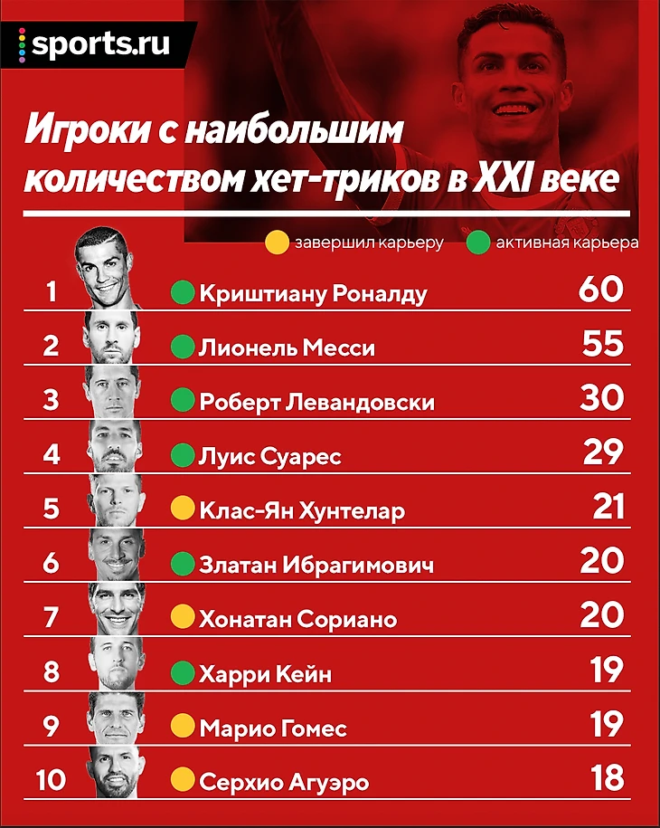 В субботу Криштиану Роналду вырвал для «МЮ» победу против «Норвича» (3:2), попутно сделав 60-й хет-трик в карьере. Португалец – единоличный лидер по количеству хет-триков в XXI веке: приличный отрыв от Лео Месси и просто колоссальный – от всех остальных.