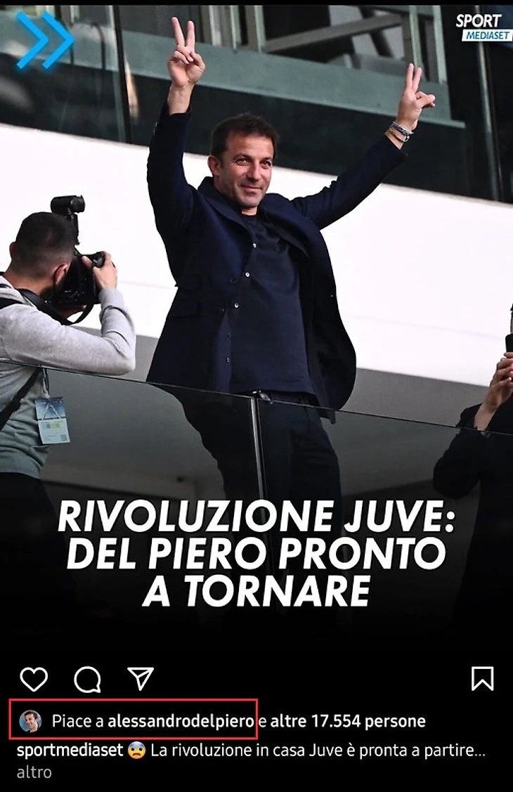 Еще один ключ к тому, насколько конкретна эта гипотеза, исходит из Instagram: Дель Пьеро поставил «лайк» под публикацией SportMediaset, в которой говорится о его возможном возвращении в «Ювентус». Знак того, что действительно что-то движется...