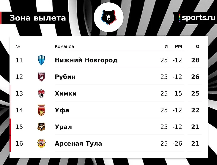 За невылет из РПЛ тоже гонка: «Рубину» правда грозит ФНЛ, весной хуже только «Урал» и «Арсенал», а у «Химок» темп лидеров