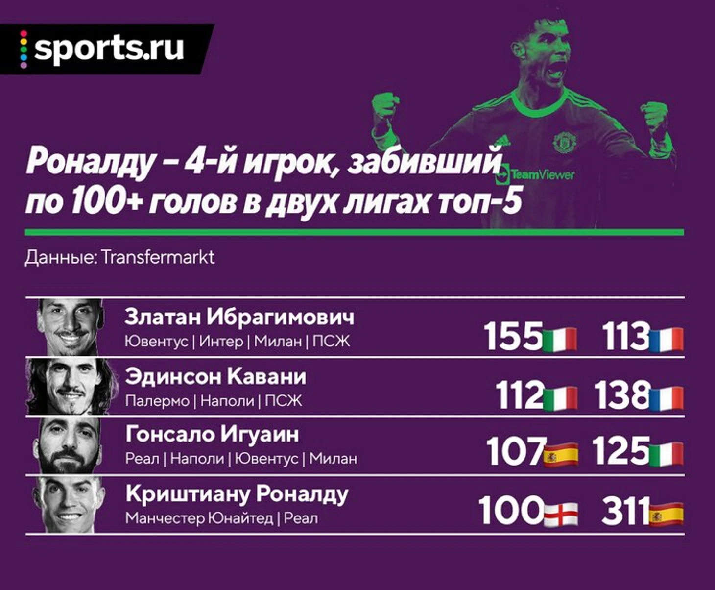 Роналду стал лишь четвертым игроком, забившим 100+ в двух разных чемпионатах. Забавно, что раньше Криша это сделал его бывший партнер по «Реалу» Гонсало Игуаин и нынешний одноклубник Эдинсон Кавани.