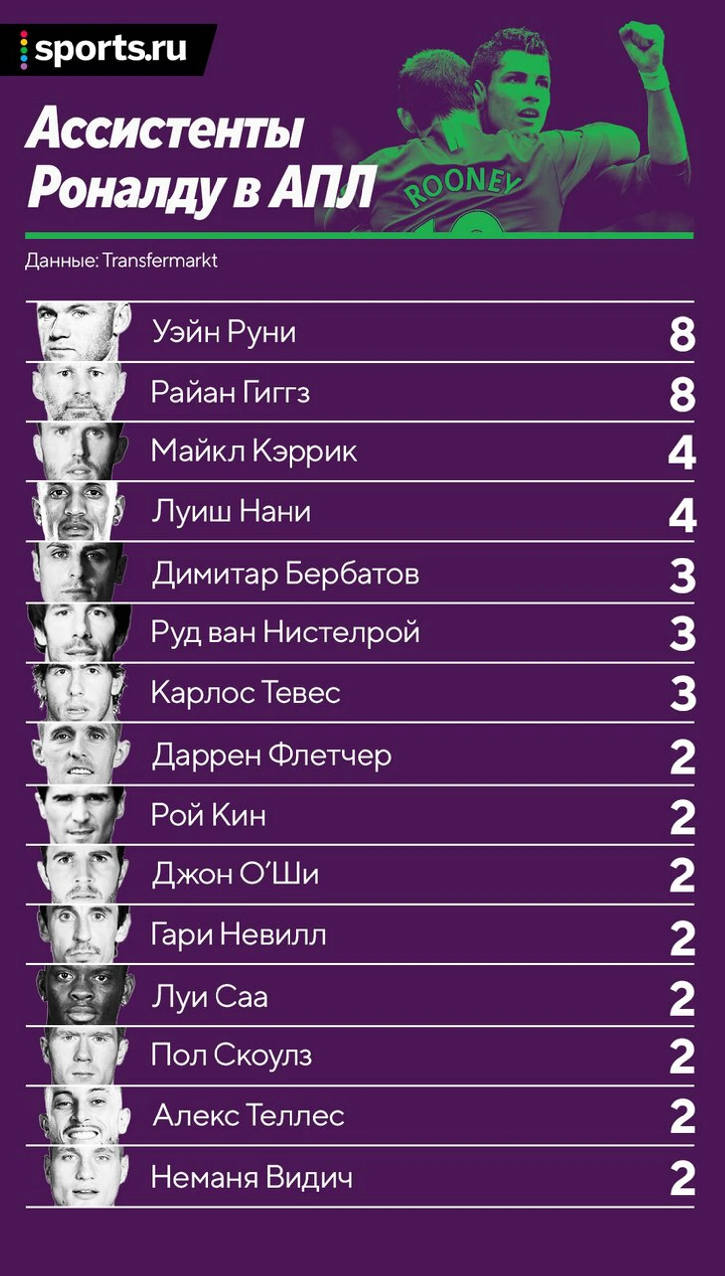 Кстати, Руни и Гиггз – лучшие по ассистам на Криштиану (оба оформили по восемь). Сразу 15 игроков «Ман Юнайтед» отдали на Роналду больше одного ассиста.