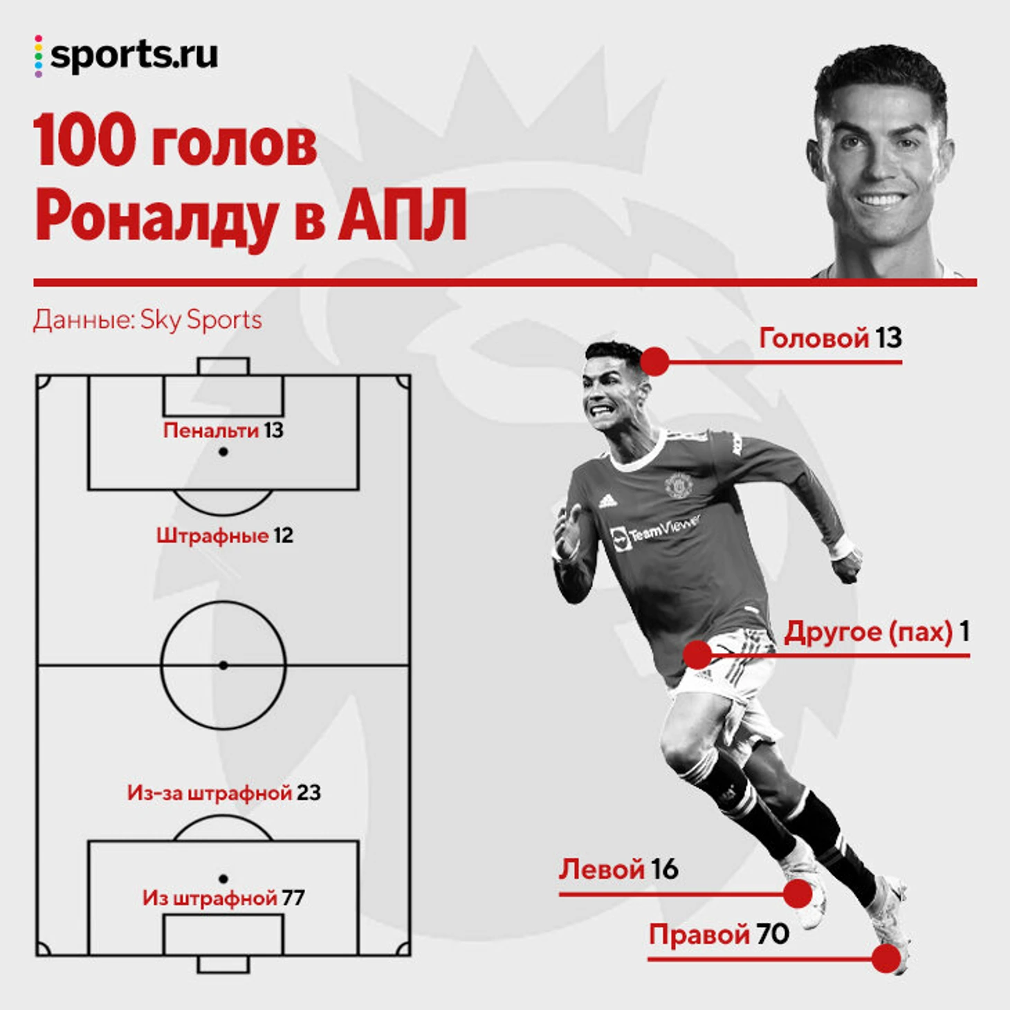 100 голов Роналду в АПЛ: поровну пенальти и штрафных, есть гол пахом, лучшие напарники – Руни и Гиггз