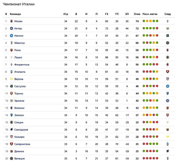 После 34 тура в гонке за скудетто осталось две команды: Милан и Интер. На данный момент россонери опережают нерадзурри на 2 очка. Календарь команд: