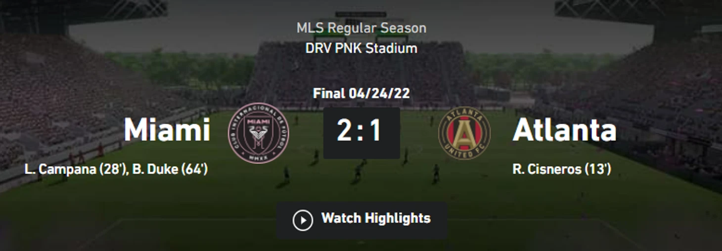 Майами первый раз в своей истории выиграл 4 матча подряд (считая победу в кубковом дерби с ФК Майами). В этих матчах на счету Леонардо Кампана хет-трик в ворота Революшн, победный гол в кубке и гол в ворота Атланты.