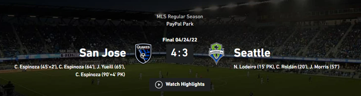 Дела сначала у Кавело пошли не очень. К 20 минуте Сан Хосе горел 0:2. Но Сан Хосе не просто совершил камбэк и выиграл в итоге 4:3. Это был первый случай в истории Сиэтла, когда команда проиграла матч, выигрывая 2 и более мячей. Историческое событие, рожденное необыкновенно неуверенной игрой вратаря Сиэтла Фрея и сомнительным пенальти в компенсированное время.