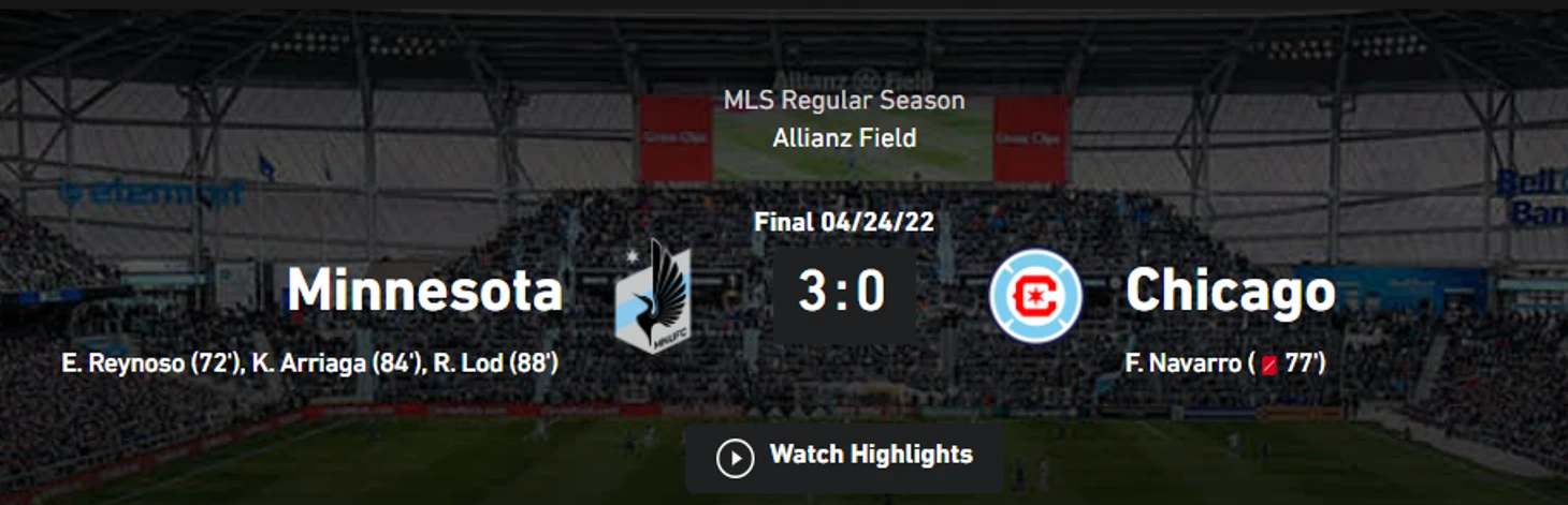 Чикаго шел к своей очередной классической нулевой ничьей, но Уайатт Омсберг привез гол на 72 минуте матча. Через 5 минут был удален Наварро. За следующие 11 Миннесота еще дважды наказала гостей. 0:3. У Чикаго всего два очка и ни одного забитого мяча в 4 последних играх.