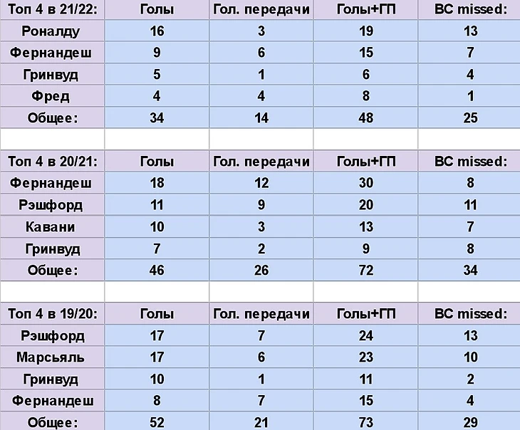 Самое важное, что бросается в глаза, в прошлых сезонах было по 3 игрока, которые взяли отметку, как минимум, в 10 забитых голов, в этом сезоне у команды, предполагаю, с вероятностью в 99%, не будет даже игрока под номером 3, который сможет забить хотя бы 7 голов (это минимум для четвёртого игрока группы атаки в прошлых 2 сезонах), а не 10. Разница налицо, из команды, которая равномерно распределяла голевые действия, как минимум, на 4 игроков группы атаки, «Ман Юнайтед» превратился в зависимую от 1 игрока команду. Нынешней топ 4 бомбардиров «Ман Юнайтед» нужно записать на свой счёт 12 голов в последних 4 турах и 24 результативных действий в целом, чтобы сравняться с прошлым сезоном, а чтобы догнать топ 4 из сезона 19/20 - нужно ещё больше действий, возможно ли такое? Чисто теоретически - да, но в реальности - это ближе к фантастике. Почему игра на 1 игрока является проблемой на дистанции? Особенно в случае с Криштиану Роналду? Есть несколько причин: 1. Отсутствие превосходства над данными игроков из прошлых сезонов, к примеру, прошлые сезоны Маркуса Рэшфорда всё ещё сильнее, чем у португальца, хотя англичанин даже не играл центрального нападающего, не говоря уже об отметке в 30 рез.действий Бруну Фернандеша. 2. Распределение голов Криштиану Роналду по сезону оставляет желать лучшего, он делает хет-трики, что великолепно, но почти в 70% матчей, в которых он выходит в АПЛ, отсутствуют забитые голы с игры, то есть статистика набивается исключительно из небольшой выборки матчей, согласитесь, это большая проблема, когда команда полагается исключительно на голы одного центрального нападающего.
