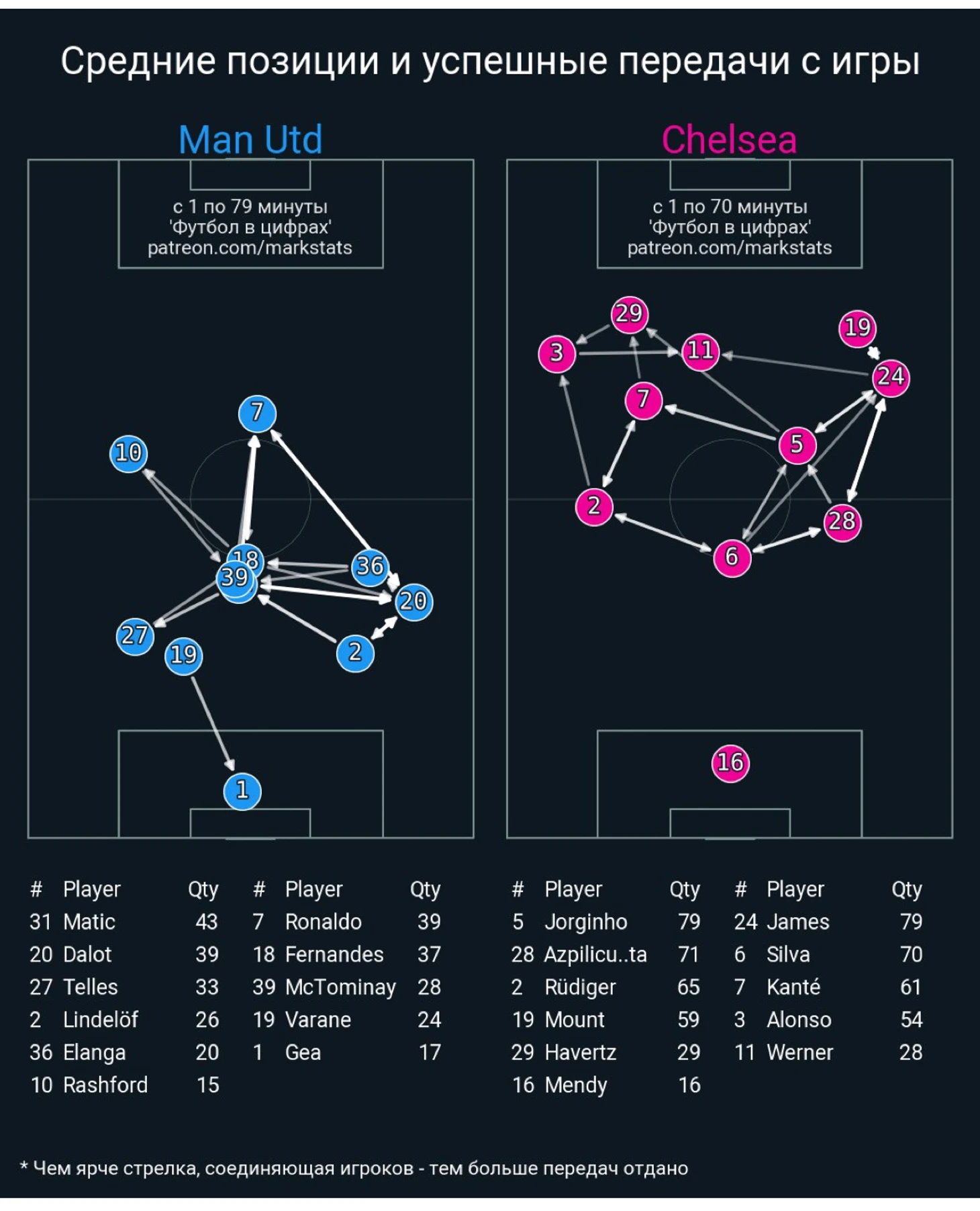 Это карта передач между футболистами, чем ярче линия, тем чаще были передачи осуществлены. Тут не нужно быть аналитиком и мне диванному эксперту очевидно, что Роналду - главная фигура, которую партнеры ищут глаза на поле, во всяком случае в группу атаки так уж точно. Откуда взялась моя последняя оговорка, в конкретном матче чаще Рона мяч был адресован только Матичу - что тоже понятно, затем идет Рон, Диого (КАК?! Все просто не знаем, что делать с мячом) и Бруно. И здесь вспоминаем из предыдущего пункта "виноват дающий", но не в данном случае, так как если твой соперник знает, что ты самая главная, даже наверное единственная опция в атаке и все будут делать тебе передачи, как ты не перемещайся по полю, чтобы ты не делал, все равно качество приема твоего будет страдать (читаем, как ухудшаться). Добавлю, что помимо Роналду и Бруно было еще 2 футболиста в матче, которые призваны были атаковать ворота соперника Эланга и Решфорд, на двоих эти футболисты получили 35 передач, вот и думайте, а мы пока двинемся дальше.