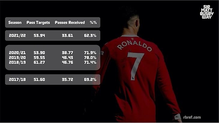 Разъяснения Pass Targets - как часто Рон был футболистов которому была адресована передача, в количестве передач в среднем за матч, Passes Received - полученные передачи в среднем за матч, ну и %% - процента успешности. О чем это нам говорит, Ну первое, что на Рона делают передачи не так мало, как многим кажется, более того, в этом сезоне показатель сравни последнему сезону в Юве и Реале, а тут важно напомнить, что ожидаемые голы xG в тех сезонах составляли 29.8 и 27.0 против 16.1 в этом - практически двух кратная пропасть. Сейчас такой промежуточный вывод - Роналду меньше бьет и меньше угрожает воротам соперника, но передачи в его адрес летят не меньше, чем раньше, конечно вопрос в качестве этих передач. Об этом и поговорим. Раз уж начали говорить и сравнивать последние сезоны в Юве и Реале, то возьмем их в очередной раз для сравнения, и там, и там, Криштиану чаще получал адресованные ему мячи. Помнится мне, я где-то слышал "виноват дающий" и тут мы перейдем к следующему пункту моего монолога.