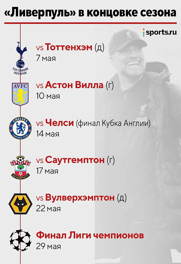 Самый сложный матч в АПЛ 7 мая с Тоттенхэмом, от его исхода будет многое зависеть, а дальше уже только надежда на осечку Сити. Нет, конечно Вулверхэмптон, Саутгемптон и Астон Вилла лапки кверху точно не сложат, но если Ливерпуль сможет обыграть Тоттенхэм, то думаю ресурсов закончить эти матчи с нужным для себя результатом должно хватить. Ну и финалы, конечно тоже непростые, что Челси, что Реал/МС команды очень крутые, в таком графике с командами такого уровня может быть очень тяжело даже просто физически восстановиться к этим матчам