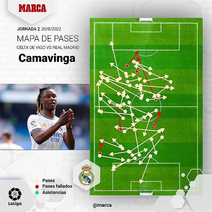 У Камавинги совсем другая история. Выйдя на поле на 75-й минуте, чтобы заменить Каземиро и Модрича, француз в одиночку взял на себя организационные и административные задачи, вновь продемонстрировав изящество своей левой ноги, во многом напоминающее Фернандо Редондо. Кроме того, в свои 19 лет Эду с огромной эффективностью разбивает линии прессинга, как это было при счете 3-1. Он получил хороший пас от Куртуа в семидесяти метрах от ворот соперника, беспрепятственно продвинулся вперед на сорок метров, выждал момент, когда Родриго откроется справа, и отдал ему пас, который предшествовал пенальти на Бензема и счету 3-1. Когда Мадрид уже был впереди, он распределял и отбирал мяч, демонстрируя зрелость, не свойственную подростку.