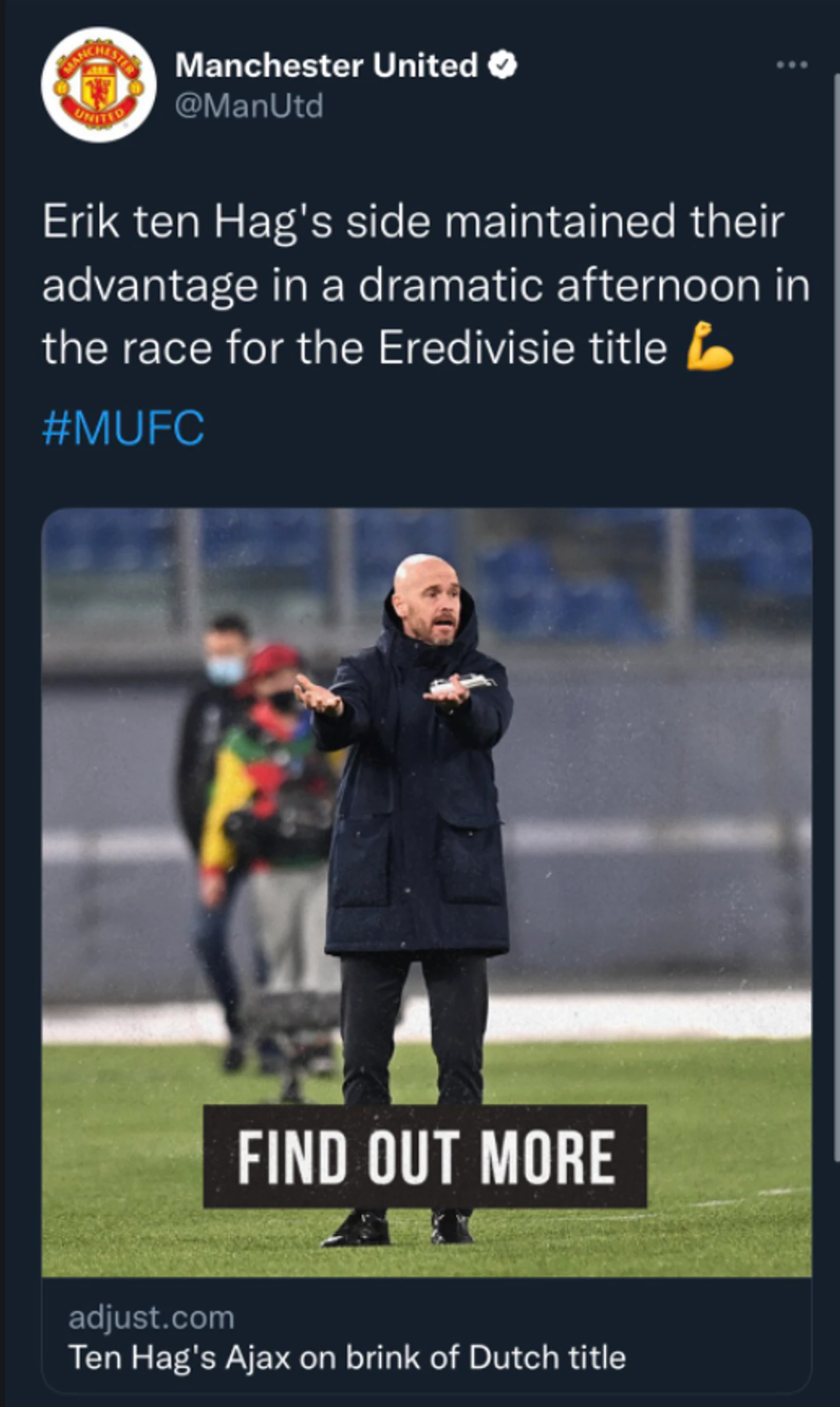 В твите было написано, что «команда Эрика Тен Хага сохранила свое преимущество в драматический гонке за титул Эредивизии».