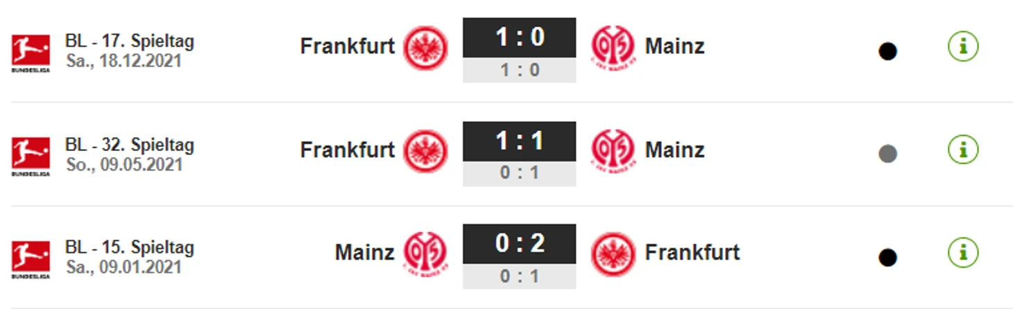 Рекорд почти готов: Майнц не выигрывал в последних трех играх против Франкфурта, но по-прежнему лидирует в общем зачете Бундеслиги с девятью победами (восемь побед «орлов», десять ничьих). «Майнц» (45 очков) однозначно финиширует впереди «Айнтрахта» (41) в таблице — это было в последний раз в сезоне 2015/16.