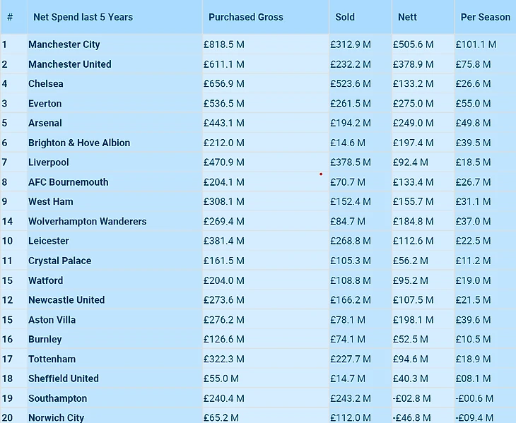 Таблица чистых расходов Премьер-лиги за последние 5 сезонов – это сумма денег, потраченных на трансферы и вырученных в результате продажи игроков каждым футбольным клубом английской Премьер-лиги за последние пять сезонов.
