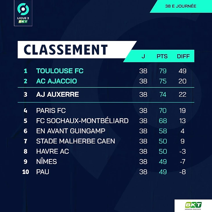 "Аяччо" обыграл "Тулузу", которой уже ничего не надо было, так как выиграла чемпионство, и стал вторым в Лиге 2, что гарантировало выход напрямую в Лигу 1. "Осер" стал третьим и сыграет с победителем матча "Пари" - "Сошо" (17 мая) за право сыграть в стыках с 18-й командой Лиги 1.