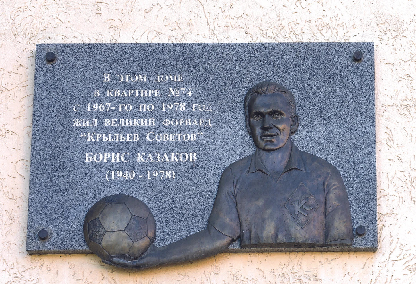 ーДве доски мы открыли, да, я инициировал вместе с моими соратниками по музею. Мы реализовали эти идеи, обратились к клубу, к меценатам. Мы даже называем их памятниками, потому что там есть изображения футболистов. Одна из них ーГалимзяну Хусаинову, серебряному призеру Чемпионата Европы 64-ого года. Он забивал в финале испанцам, сборная СССР тогда проиграла 1:2. Он доходил до полуфинала Чемпионата мира в Англии, выдающийся футболист. Потом был капитаном «Спартака» и чемпионом уже в их составе, дружил с Высоцким. И первая доска была Борису Казакову. Это самый любимый, выдающийся нападающий «Крыльев Советов». Он играл в сборной, несколько лет играл в «ЦСКА», но вернулся в «Крылья», что тогда было подвигом. Тогда играть за «ЦСКА» ー это значит быть военным. Он был лейтенантом, почти бежал из Москвы, его объявляли во всесоюзный розыск, но отстояли. Его комиссовали и он продолжил играть.