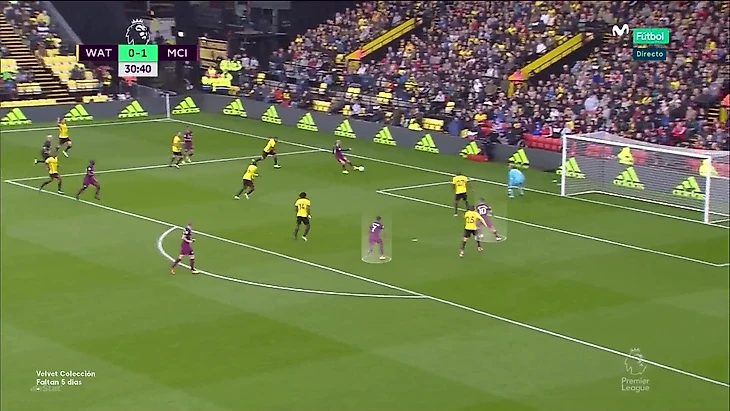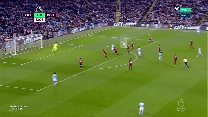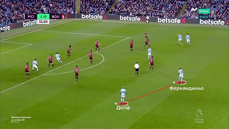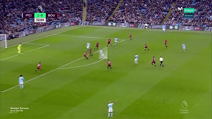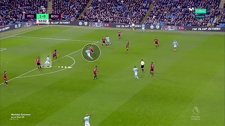 В этом эпизоде против «Борнмута» оголял пространство в чужой опорной как ситуативная ложная девятка. Первый шаг – КДБ уводит полузащитника и создает зону в чужой опорной (Агуэро уже заметил это и готов опускаться):