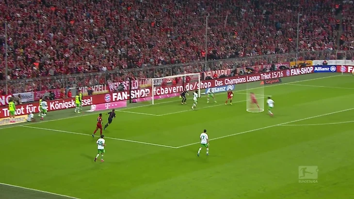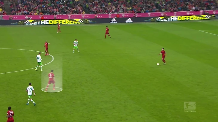 Когда команда в финальной стадии атаки, нападающий возвращается в штрафную и уже действует классическим образом. Именно так действовал Левандовски. Вот пример из легендарного матча против «Вольфсбурга» (5 голов Роберта за 9 минут). Опускается в опорную в первой стадии: