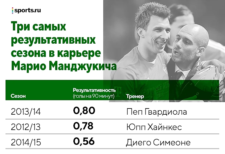Именно при Пепе Манджукич провел самый результативный сезон в карьере. Да, разница с кампанией при Хайнкесе минимальная, но тут важнее не формальный статус лучшего, а тот факт, что уровень игры при системе Пепа точно не упал (возможно, даже наоборот):