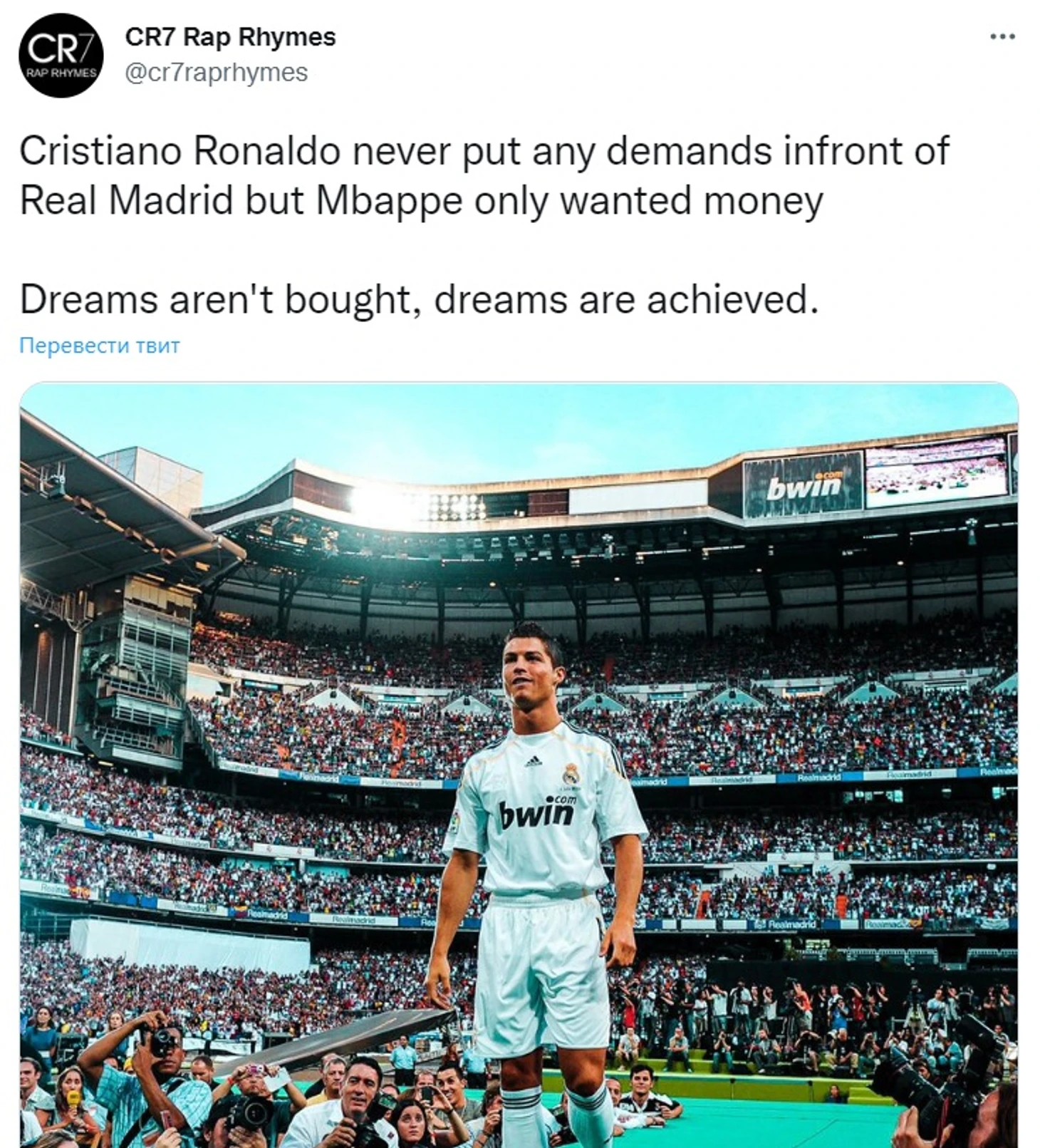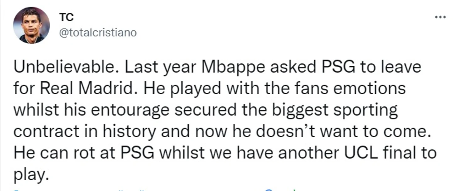 «Криштиану Роналду никогда не выдвигал требований «Реалу», а Мбаппе хотел только денег. Мечты не покупаются, мечты достигаются»