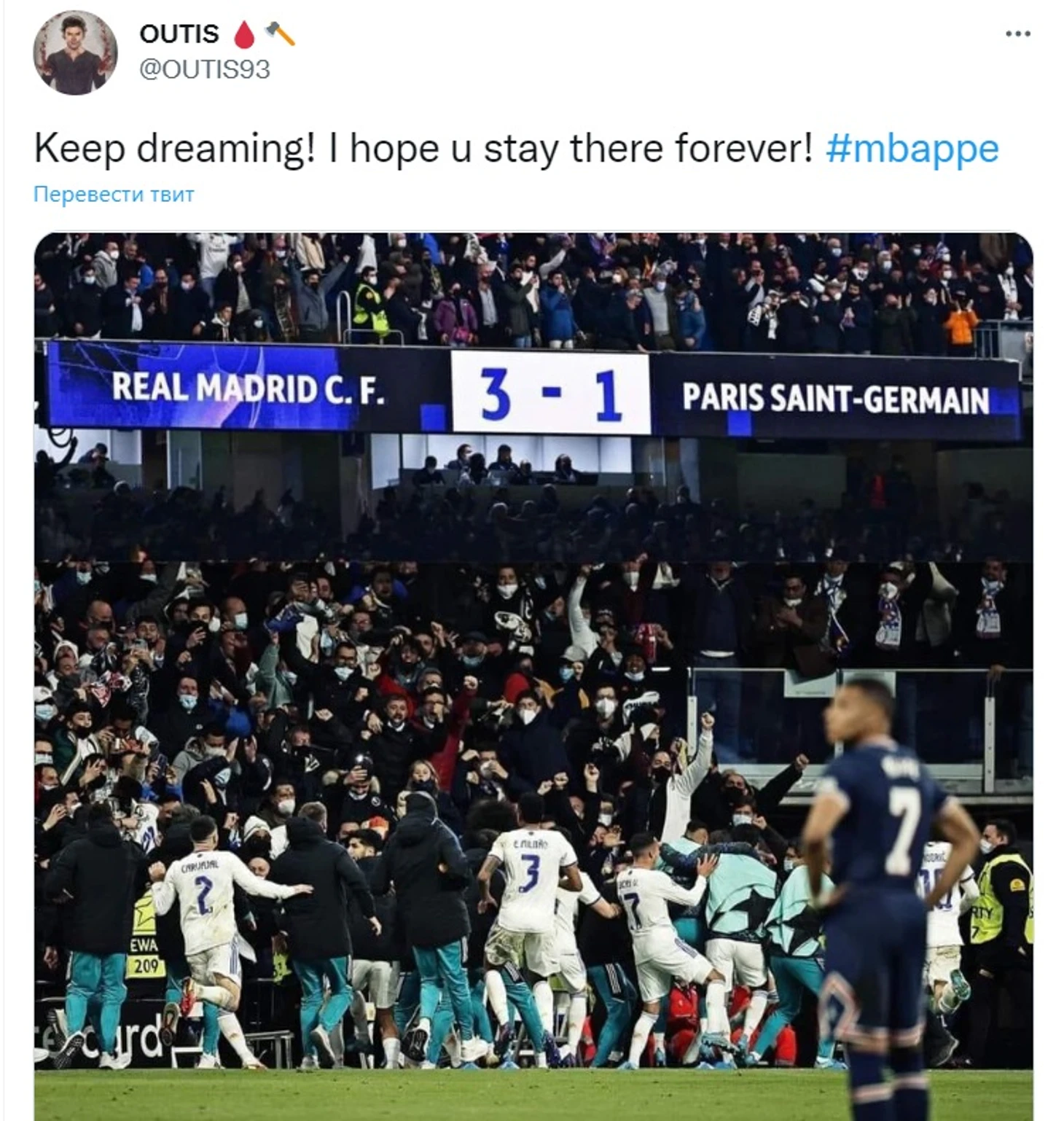 «Невероятный. В прошлом году Мбаппе попросил о трансфере в «Реал». Он играл на эмоциях болельщиков, в то время как его окружение заключило самый крупный спортивный контракт в истории. Он может сгнить в ПСЖ, ну а мы пока сыграем еще один финал ЛЧ»