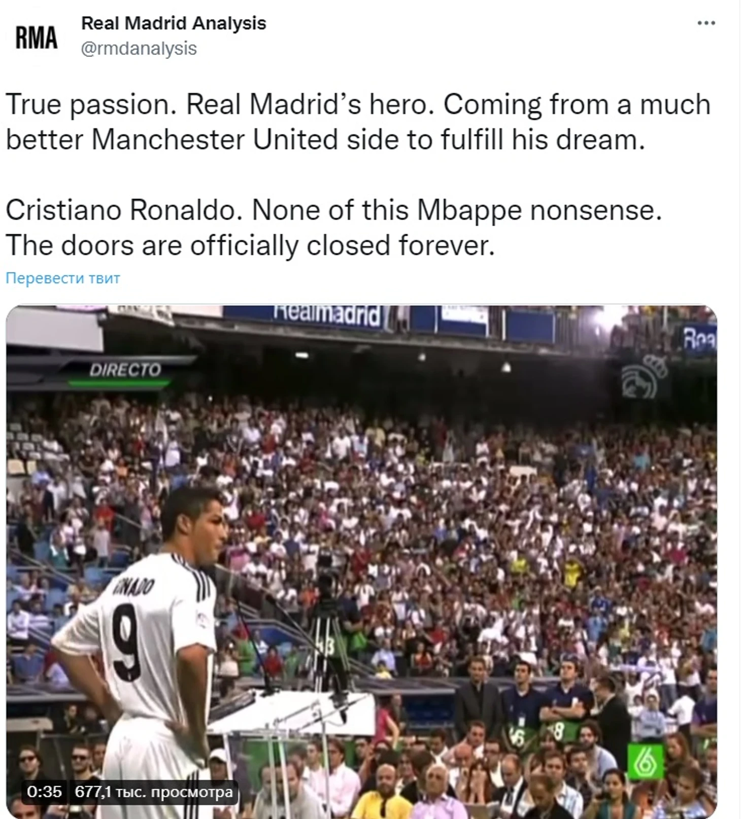 «Истинная страсть. Герой «Реала». Он пришел из гораздо лучшей команды, чтобы осуществить свою мечту. Криштиану Роналду. Никакой чепухи про Мбаппе. Для него двери официально закрыты навсегда»