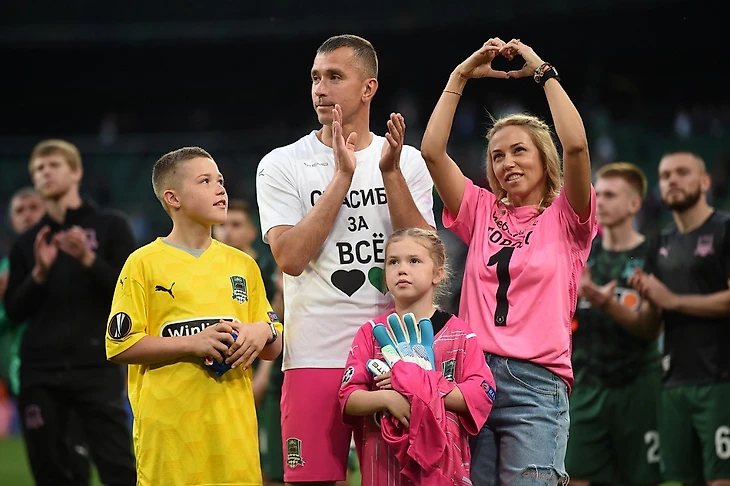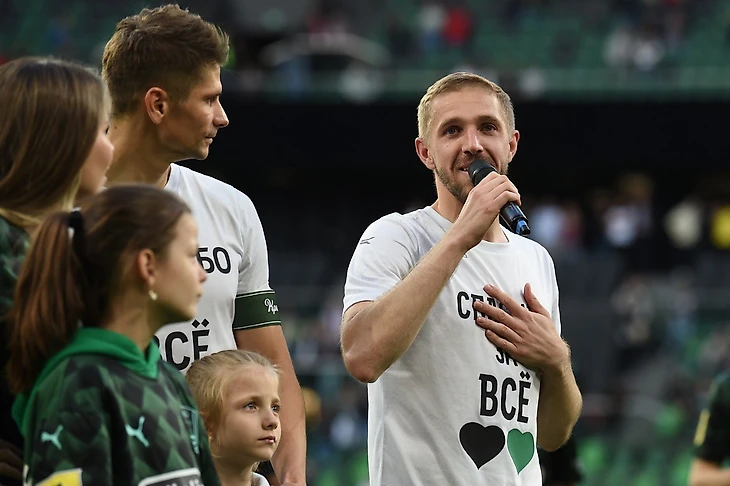 Всем здравствуйте! Хочу поблагодарить вас за то, что пришли поддержать нас в последнюю игру сезона. Последний наш матч за футбольный клуб «Краснодар» . Большое вам за это спасибо. Я двенадцать лет в клубе и я помню, как всё это начиналось. Как была небольшая группа болельщиков. Сейчас у нас целый стадион. Нет свободных мест. Столько желающих. Это очень дорогого стоит. За двенадцать лет клуба я рос вместе с клубом. Так же как и вы. Мы росли: я где-то в мастерстве, вы в своем количестве. Хочется поблагодарить ребят, с кем на протяжении долгих лет плечом к плечу защищали цвета нашего любимого клуба. Спасибо вам, ребята! Поблагодарить тренеров, всех с кем работали мы. Каждый из них приносил нам что-то новое. Мы у каждого из них чему-то учились. Спасибо им. Спасибо нашему медицинскому штабу, персоналу за постоянную заботу о нас. Спасибо вам большое! И, конечно, же отдельное спасибо Сергею Николаевичу и нашему генеральному директору Владимиру Леонидовичу, всему руководству клуба за те фантастические возможности, которые нам предоставляли для работы, чтобы мы ни о чем не думали, чтобы мы только сконцентрировались на футболе. Спасибо вам! Краснодар стал для меня вторым домом. Здесь родились и выросли мои девочки. Поэтому я душой и сердцем всегда здесь. Если подытожить, то всем еще раз спасибо! Я надеюсь еще увидимся. Вперед, быки!