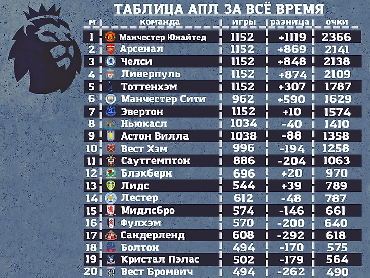 В воскресенье закончился очередной сезон Английской Премьер-лиги. Периодически я играю в футбольный менеджер и там появляется интересная картинка: таблица чемпионата по итогам всех сезонов. Стало интересно, как дела обстоят в АПЛ, поэтому и подготовил таблицу. Удивился, что лишь шесть клубов играют в высшей лиге начиная с истоков АПЛ. Ещё больше удивился, когда узнал, что в это число входит Эвертон. В общем, получилось интересно.