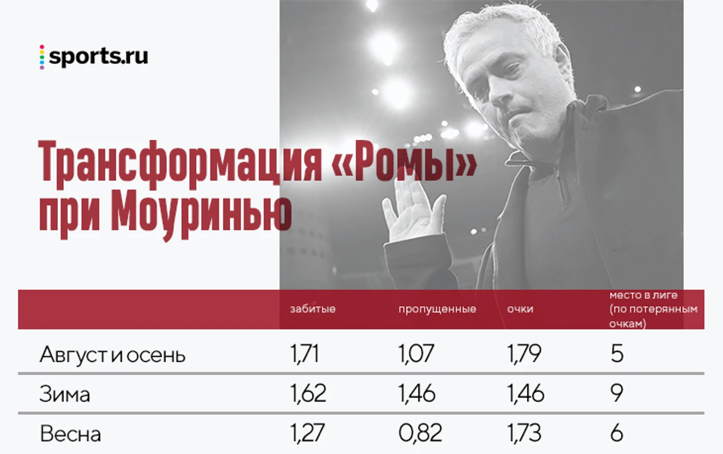 Отчасти тезис подтверждает прямое сравнение с прошлым годом. Как и положено команде Моуринью, «Рома» меньше забила и меньше пропустила, а очков набрала примерно столько – 63 против 62 при Фонсеке. Небольшой подъем (с 7-й позиции на 6-ю) скорее объясняется весенним крахом «Аталанты», чем прогрессом Жозе.