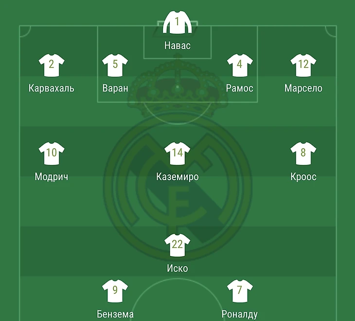 «Реал»: Навас- Марсело, Рамос, Варан, Карвахаль (Начо, 37) - Каземиро, Модрич, Кроос -Иско (Бэйл, 61), Роналду, Бензема (Асенсио, 89).
