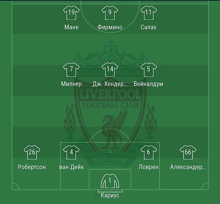 «Ливерпуль»: Кариус- Робертсон, ван Дейк, Ловрен, Александр-Арнольд- Хендерсон, Милнер (Эмре Джан, 82), Вейналдум - Салах (Лаллана, 31), Фирмино, Мане.