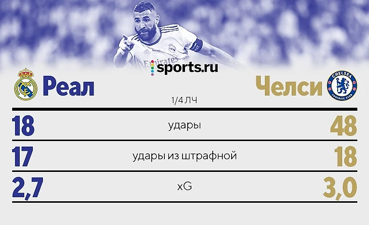 Первый матч с «Челси» – новый хет-трик Бензема. После 3:1 в Лондоне казалось, что «Реал» спокойно доедет до полуфинала, но в ответной игре все перевернулось. К 75-й минуте «Челси» вел 3:0 – «Реал» спасся и тут.