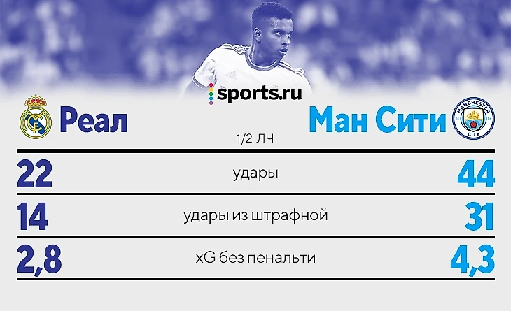 «Реал» показал великий дух, но снова уступил по ключевым атакующим показателям. Из-за первого матча – в ответном соперники были почти равны (14-15 по ударам в пользу «Сити», но 11-9 по ударам из штрафной и 1,9-1,6 по xG в пользу испанцев).