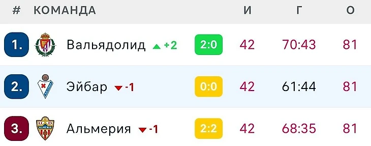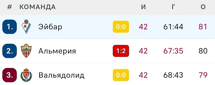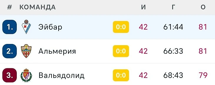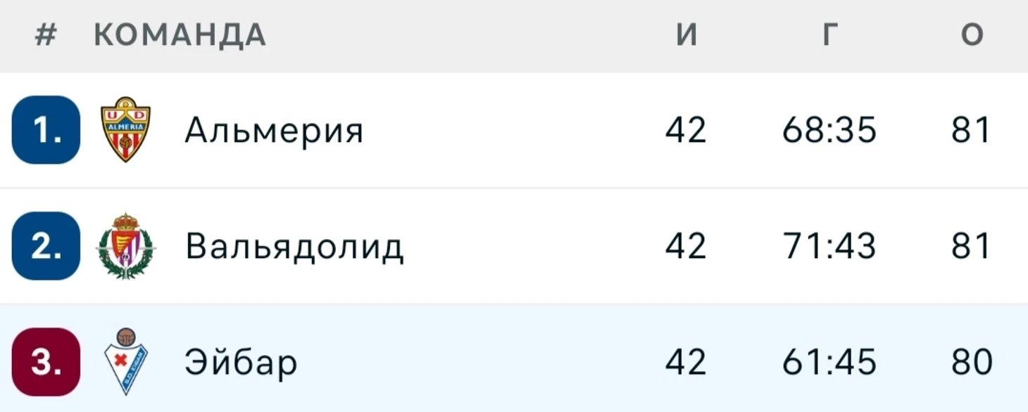 «Эйбар» претендовал на одну из двух прямых путевок в Примеру. Вот положение команд на старте заключительного матча. «Оружейники» лидировали в лиге, поскольку превосходили «Альмерию» по личным встречам.