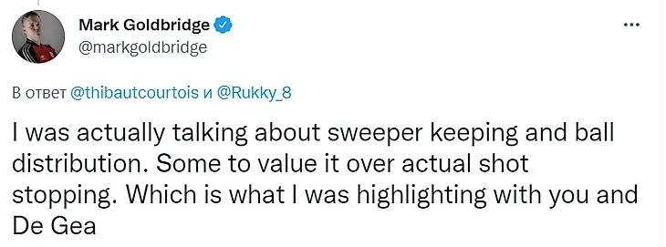 «На самом деле я говорил о вратарях, предпочитающих играть на линии, а некоторые ценят игру на выходах больше, чем сэйвы. Это то, что я хотел подчеркнуть у тебя и у Де Хеа».