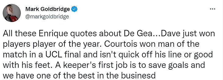 Известный британский журналист и болельщик «Манчестер Юнайтед» Марк Голдбридж отреагировал на решении босса сборной Испании Луиса Энрике не вызывать на летние матчи кипера «МЮ» Давида де Хеа.