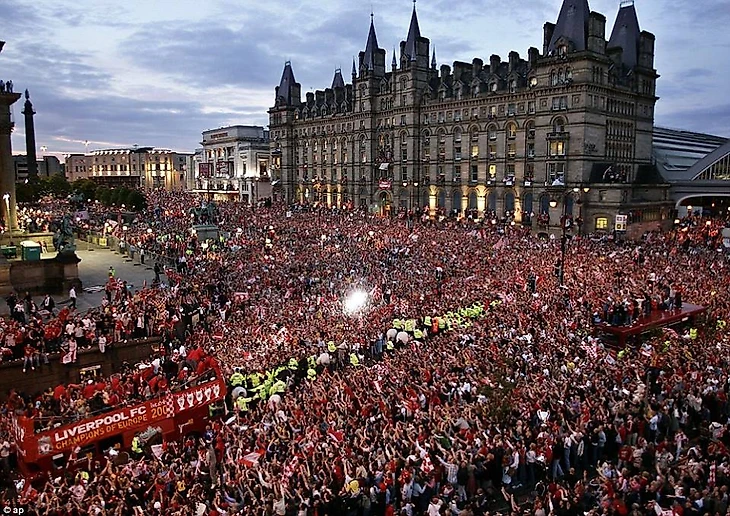 Подавляющее большинство из тех, кто был в Стамбуле, не вернулись домой вовремя, чтобы стать свидетелями самого большого всплеска общественных эмоций, который когда-либо видел город Ливерпуль. В тот день состоялась уличная вечеринка с участием 750 000 гостей. Те, кто был на похоронах Шенкли, болельщики, которые ездили на все предыдущие парады победы в Кубке чемпионов, те, кто танцевал и пел на праздновании Требла 2001 года, и многие, многие другие — все ждали прибытия команды. В тот солнечный день жара уже спадала, когда самолет команды приземлился в аэропорту имени Джона Леннона аккурат в 16:30, после чего в сопровождении двадцати конных полицейских они направились в город.