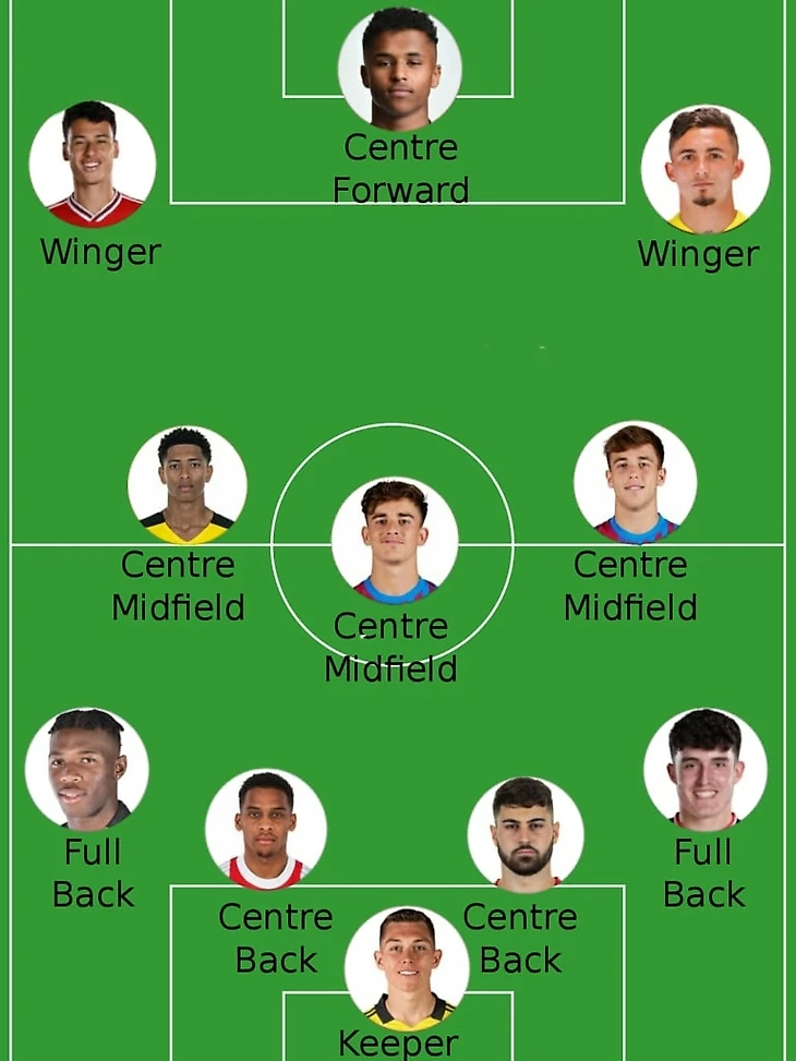 Стартовый состав: Вратарь-Габриель Слонина(18 лет, Чикаго Файр,24 матча,36 пропущенных голов,9 сухих матчей), Центральный защитник-Юриен Тимбер(20 лет,Аякс,43 матча,3 гола,2 ассиста),Центральный защитник-Йошко Гвардиол(20 Лет,Рб Лейпциг,45 матчей, 2 гола,3 ассиста),Правый Защитник-Валентино Ливраменто(19 лет, Саутгемптон,32 матча,1 гол,2 ассиста),Левый Защитник-Дестини Угодие(19 лет, Удинезе,37 матчей,5 голов,3 ассиста), Центральный Полузащитник-Джуд Билленгем(18 лет, Боруссия Дортмунд,44 матча,6 голов,14 ассистов), Центральный полузащитник-Гави(17 лет, Барселона,47 матчей,2 гола,6 ассистов), Центральный полузащитник-Нико Гонсалес(20 лет,38 матчей,2 гола,2 ассиста), Центральный Нападающий-Карим Адейми(20 лет,Рб Зальцбург,43 матча,23 гола,7 ассистов), Правый Вингер-Ереми Пино(19 лет, Вилльяреал,40 матчей,7 голов,4 ассиста),Левый Вингер-Габриель Мартинели(20 лет, Арсенал Лондон,36 матчей,6 голов,7 ассистов). Как вам состав??? Пишите свои варианты в комментариях
