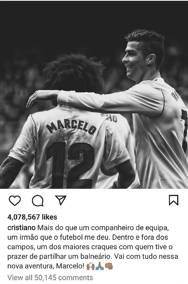 Не оставил без внимание уход из «Реала» его великий одноклубник и настоящий друг за пределами поля – Криштиану Роналду назвал бразильца братом в своем посте в твиттере: «Больше чем партнер – брат, которого футбол мне подарил. И на поле, и за его пределами это одна из величайших звезд, с которой я имел удовольствие делить раздевалку. Успехов тебе в новом приключении, Марсело!»