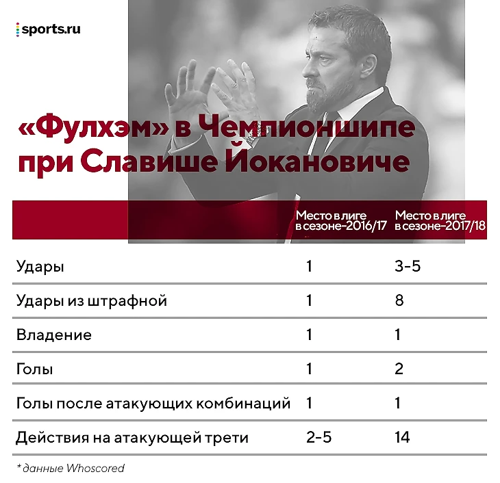 В Англии Йоканович стремился к хлесткому атакующему футболу и почти не использовал длинные передачи («Фулхэм» даже лидировал по владению и голам после комбинаций)