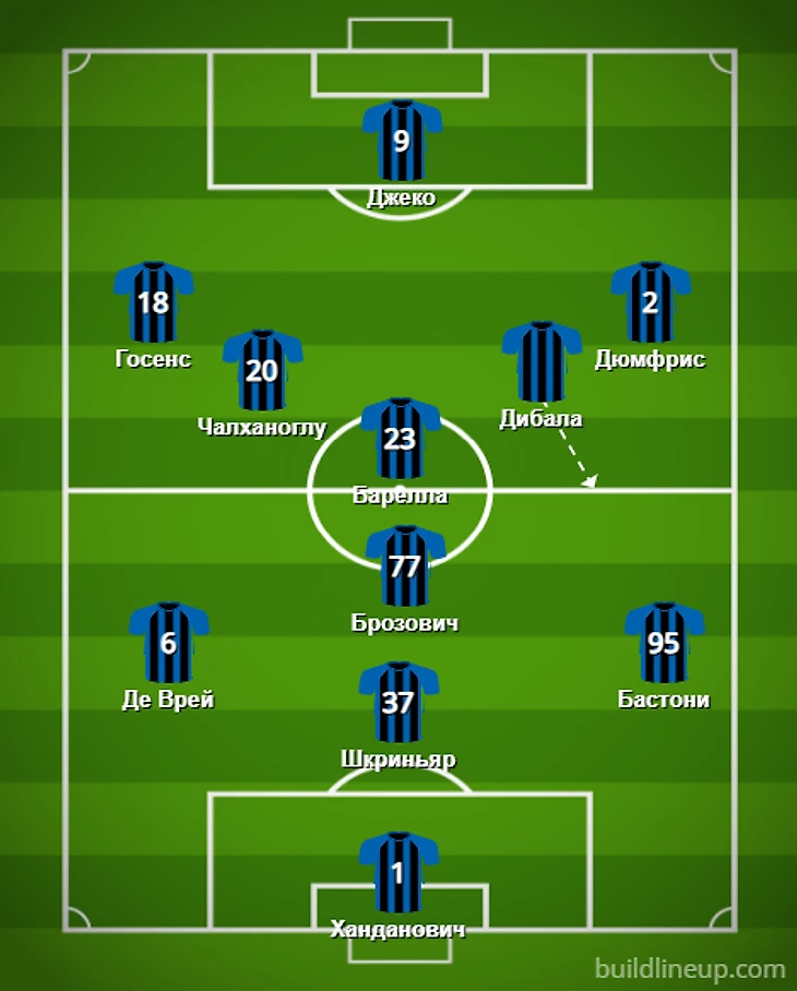И третья позиция Дибалы в «Интере» - место в тройке полузащитников. Что-то мы забили про Бареллу, а это ключевой игрок в системе Индзаги. Итальянец выполняет огромный объём беговой, атакующей и оборонительной работы. Очевидно, что без него полузащита «нерадзурри» будет выглядеть неполноценной. Поэтому Никола при любых обстоятельствах, кроме травмы и ужасной формы, будет основным игроком. Поэтому Дибала может заменить только Чалханоглу в полузащите. Но тогда ничего нового мы не увидим в игре «Интера». Так как аргентинец будет смещаться на правый полуфланг, где будет создавать численное преимущество с Госенсом.