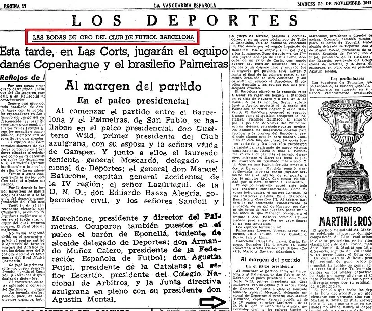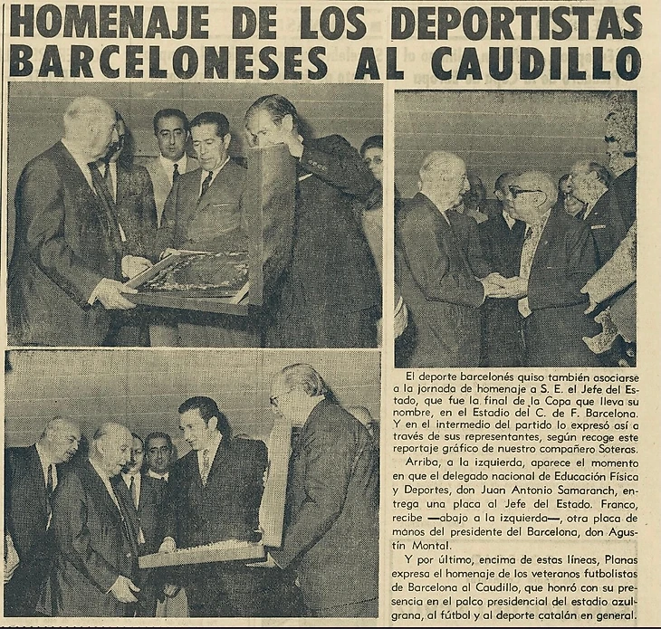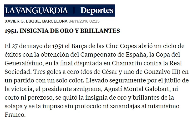 1951 год - президент «Барселоны» Агусти Монтал-и-Галобарт снял с себя золотой значок и надел его на Франко. Это произошло через несколько минут после того, как «Барса» завоевала Кубок Генералиссимуса. (3:0 против «Сосьедада»).