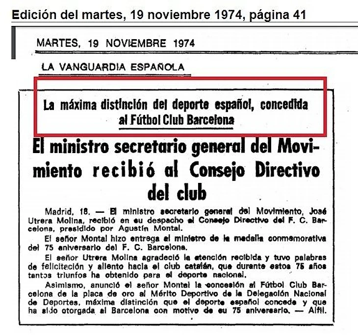 1974 год. Правительство Франко присуждает «Барселоне» высшую награду в испанском спорте.