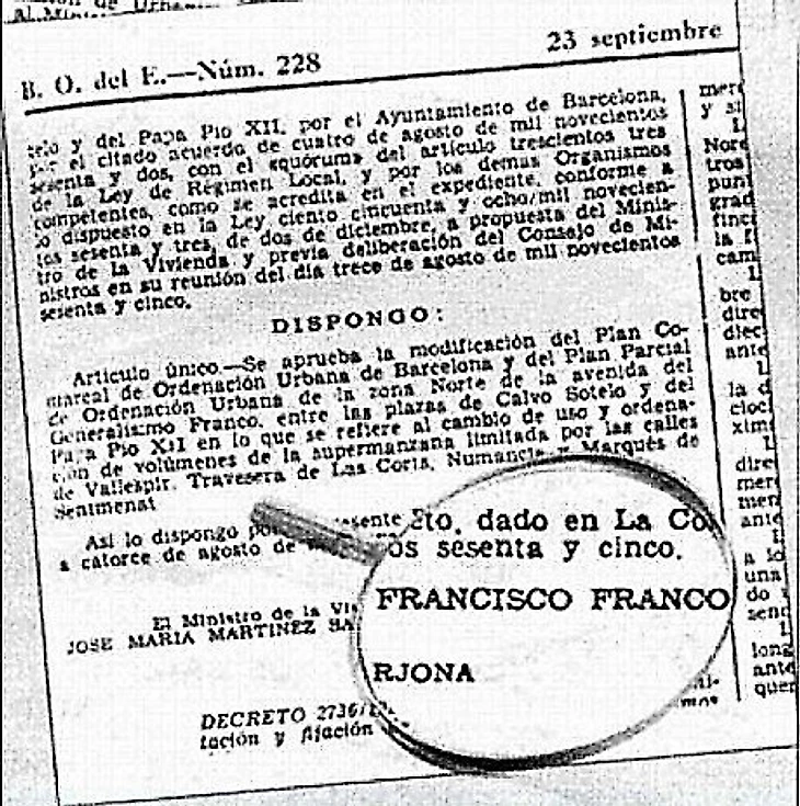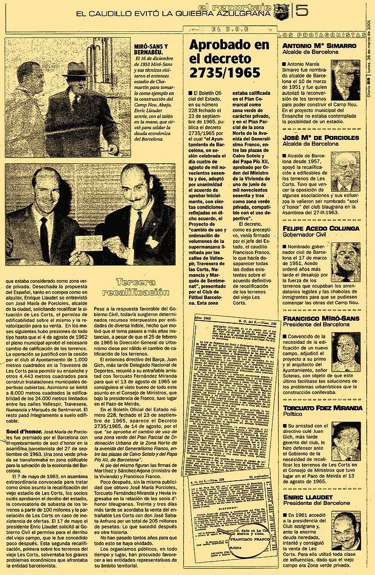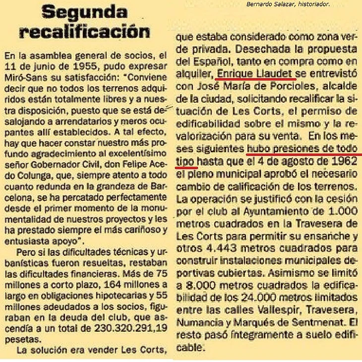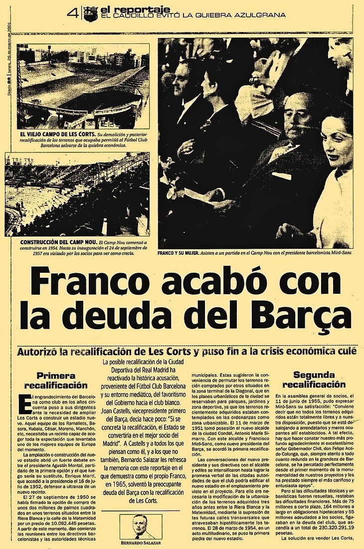 1954 год. Закладывается первый камень «Камп Ноу». Тогдашний президент «Барсы» Франсеска Миро-Санс добился с помощью правительства (благодаря реклассификации) продажи земли Кортс и публично поблагодарил Франко.