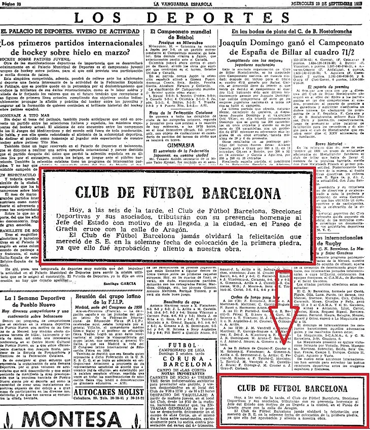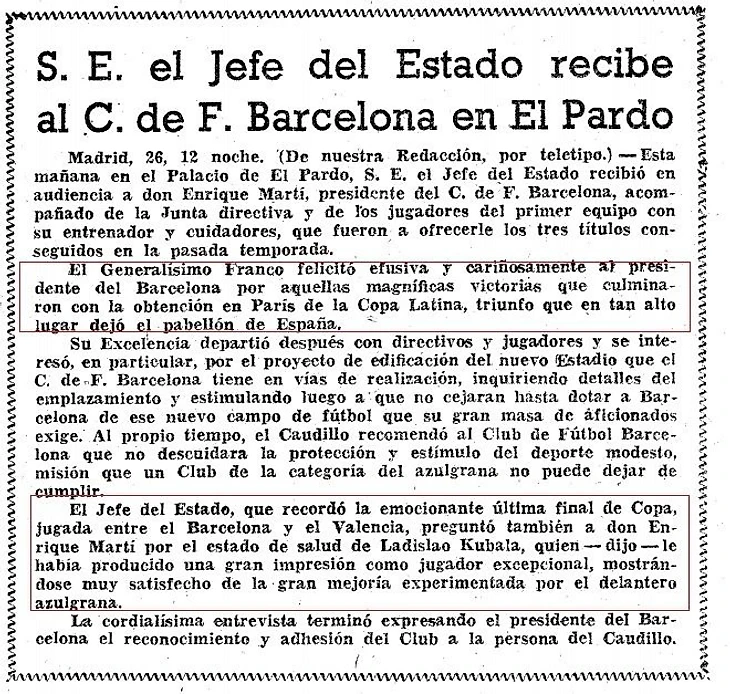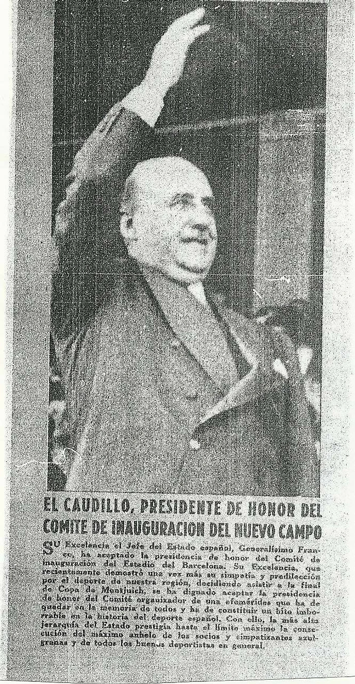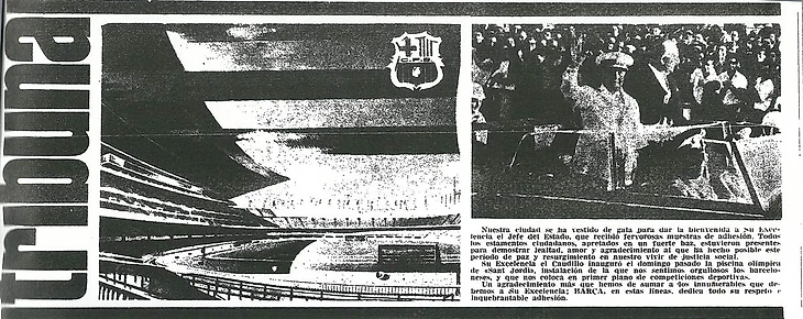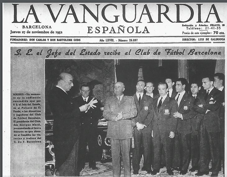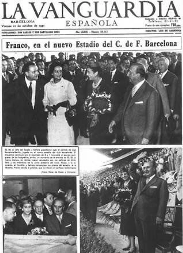 1953 год. Футбольный клуб «Барселона» через газету La Vanguardia просит своих сосьос и остальных болельщиков встречать и поощрять Франко во время его визитов в Барселону.