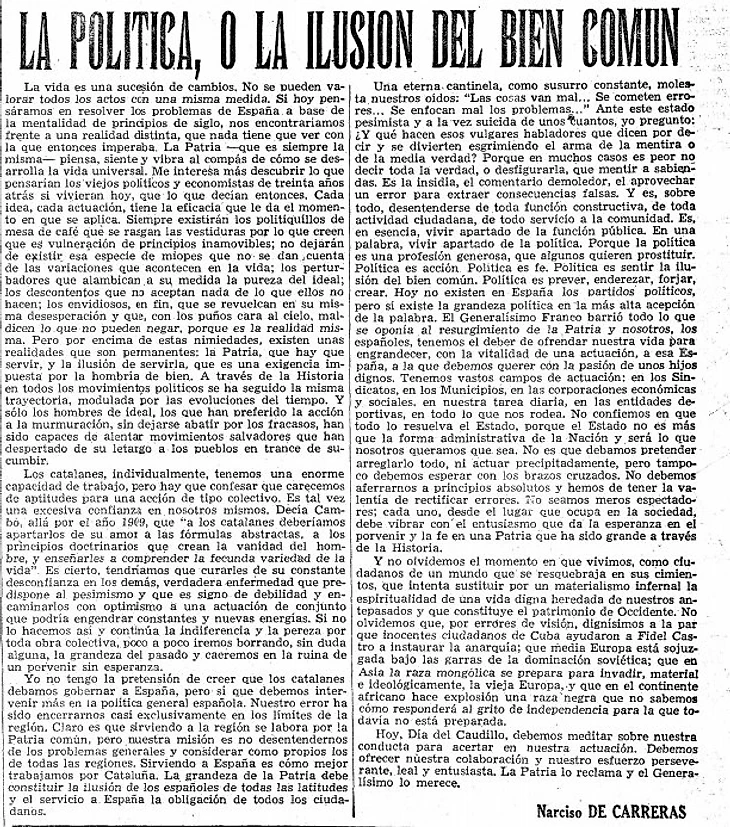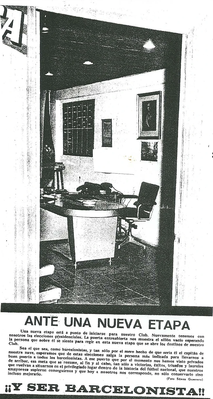 1968 год. Нарсис де Каррерас избран президентом «Барсы». Он также был директором каталонского клуба в 50-х годах и провалил подписание контракта с Ди Стефано. Он написал заметку для газеты La Vanguardia под названием «Политика или иллюзия общего блага», посвященную Франко в «День каудильо» (1 октября 1960 г.), где целиком и полностью поддержал убеждения диктатора и вновь отметил его роль в становлении клуба.