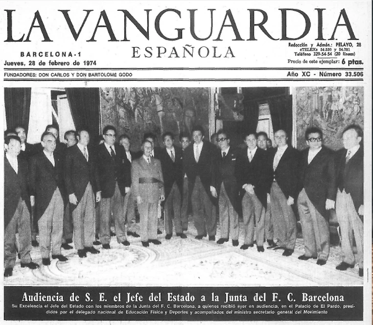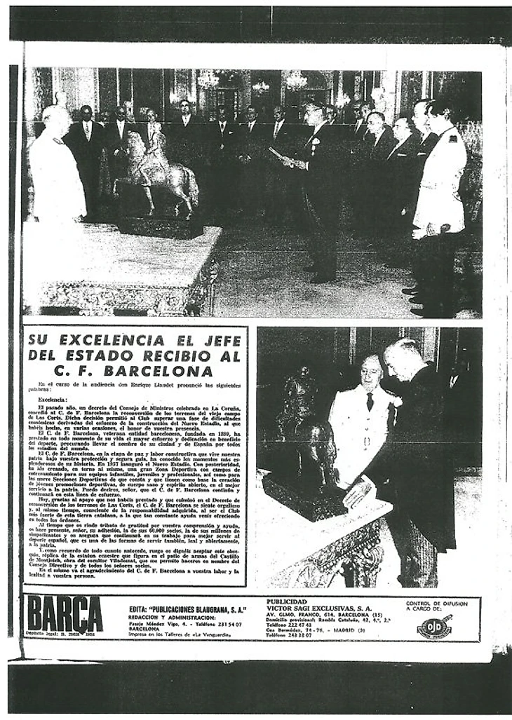 1971 год. Правление «Барсы» отдает дань уважения Франко за помощь от режима в строительстве «Палау Блауграна» и «Ледового дворца». Франко был назначен почетным президентом обеих площадок.