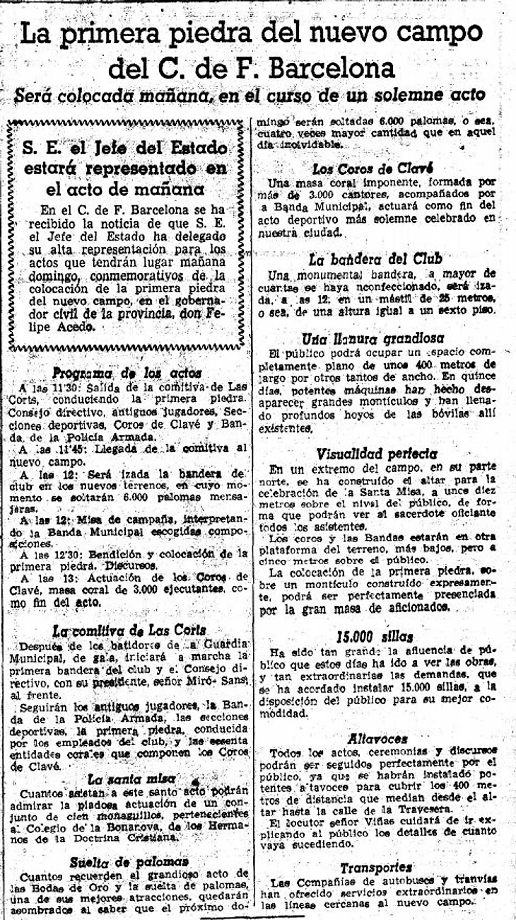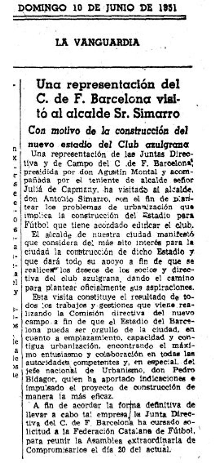 1951 год. «Барселона» стала нуждаться в расширении «Лес Кортс» или постройке нового стадиона. Власти города Барселона (естественно, ставленники режима Франко) быстро согласились на просьбу клуба обменять некоторые земли между районе Риера-Бланка и Калье-де-ла-Матернидад на другие, расположенные в районе терминала Диагональ.